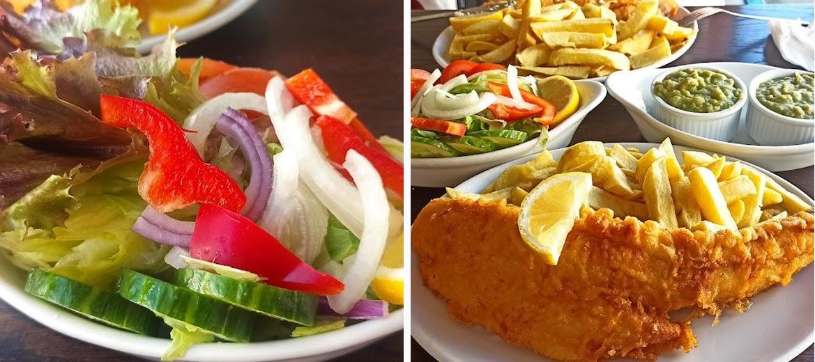 The menu features classic fish and chips, with options like cod and chips, as well as vegetarian selections and quick bites.
